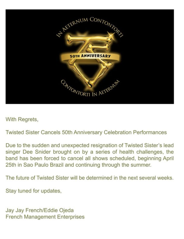 La cancelación se debe principalmente a motivos de salud de Dee Snider, vocalista y una de las figuras más reconocibles del grupo. Según ha explicado la propia banda en un comunicado, el desgaste físico acumulado tras décadas de carrera y las recomendaciones médicas han llevado a Snider a dar un paso atrás y renunciar a seguir adelante con los compromisos en directo. Esta decisión ha provocado que el resto de la formación opte por suspender toda la gira, al considerar que Twisted Sister no tiene sentido sin su cantante al frente en plenas condiciones.